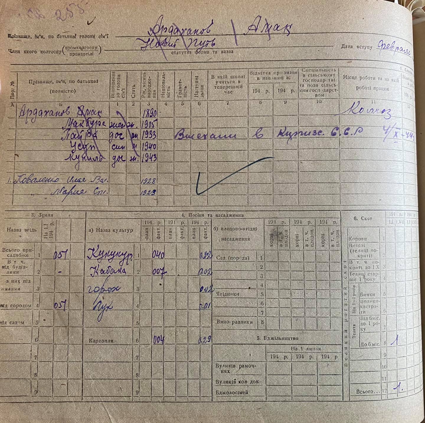 Херсон облусунун азыркы Виноградово (Чалбасы) айылындагы 1930-жылдары кулакка тартылып, сүргүнгө айдалган кыргыздардын 1944-1946- жылдары Кыргызстанга көчүп кеткендиги тууралуу айыл өкмөтүнүн каттоо китеби.